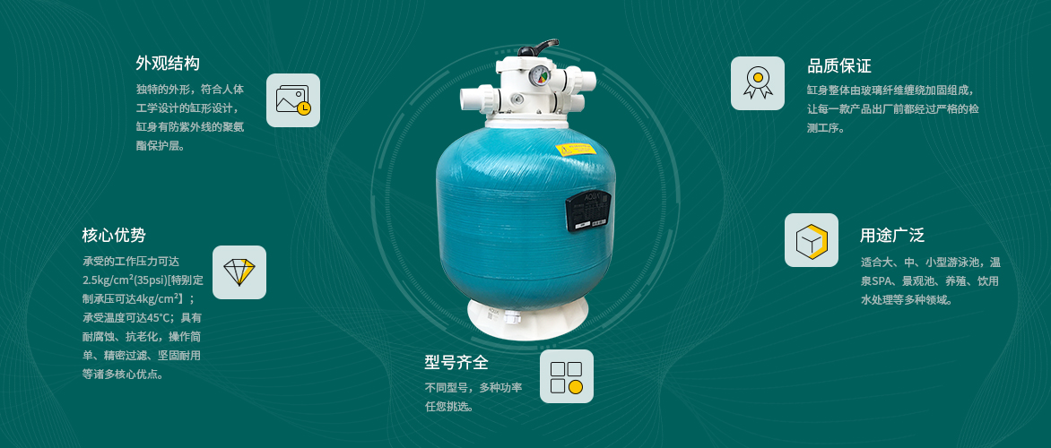 砂缸本体材质有玻璃纤维、不锈钢等材质。砂缸是利用特殊的滤沙将池中的微小污物消除。滤沙作为清除污物的介质,被装填在过滤器内的腔体内。当控制旋钮打到“FILTER"位置时,含有悬浮的污物微粒的池水由泵压入过滤装置中,再由控制开关的引导到达过滤器的出水口。