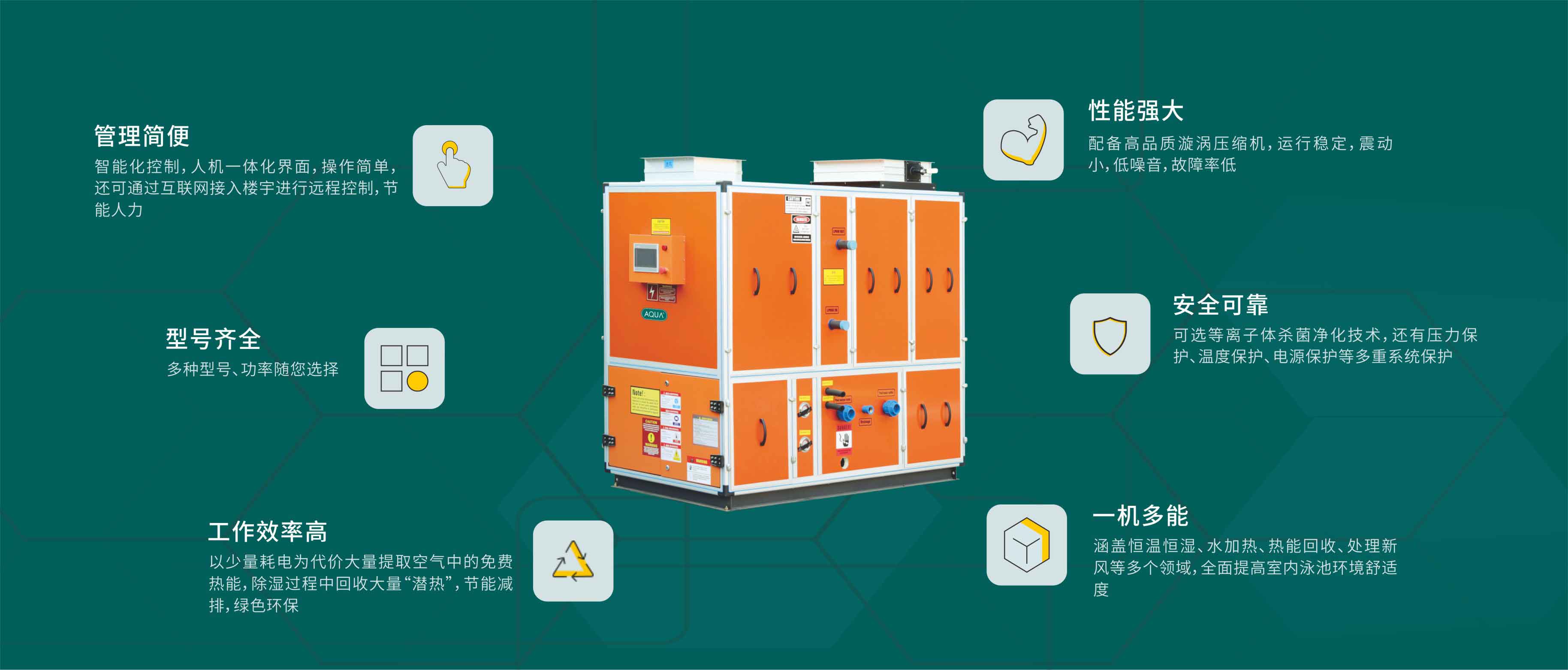 该系列产品为三集一体恒温除湿热泵机组,带池水热泵辅助加热水冷冷凝器和室外机。可同时控制室内空气温湿度,具有除湿功能、空调制冷、制热功能,池水辅助加热功能和池水恒温功能。池水初始加热由空气源热泵或电加热实施。